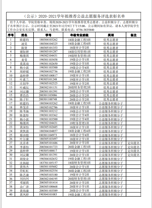 (公示)2020一2021学年拟推荐公益志愿服务评选表彰名单