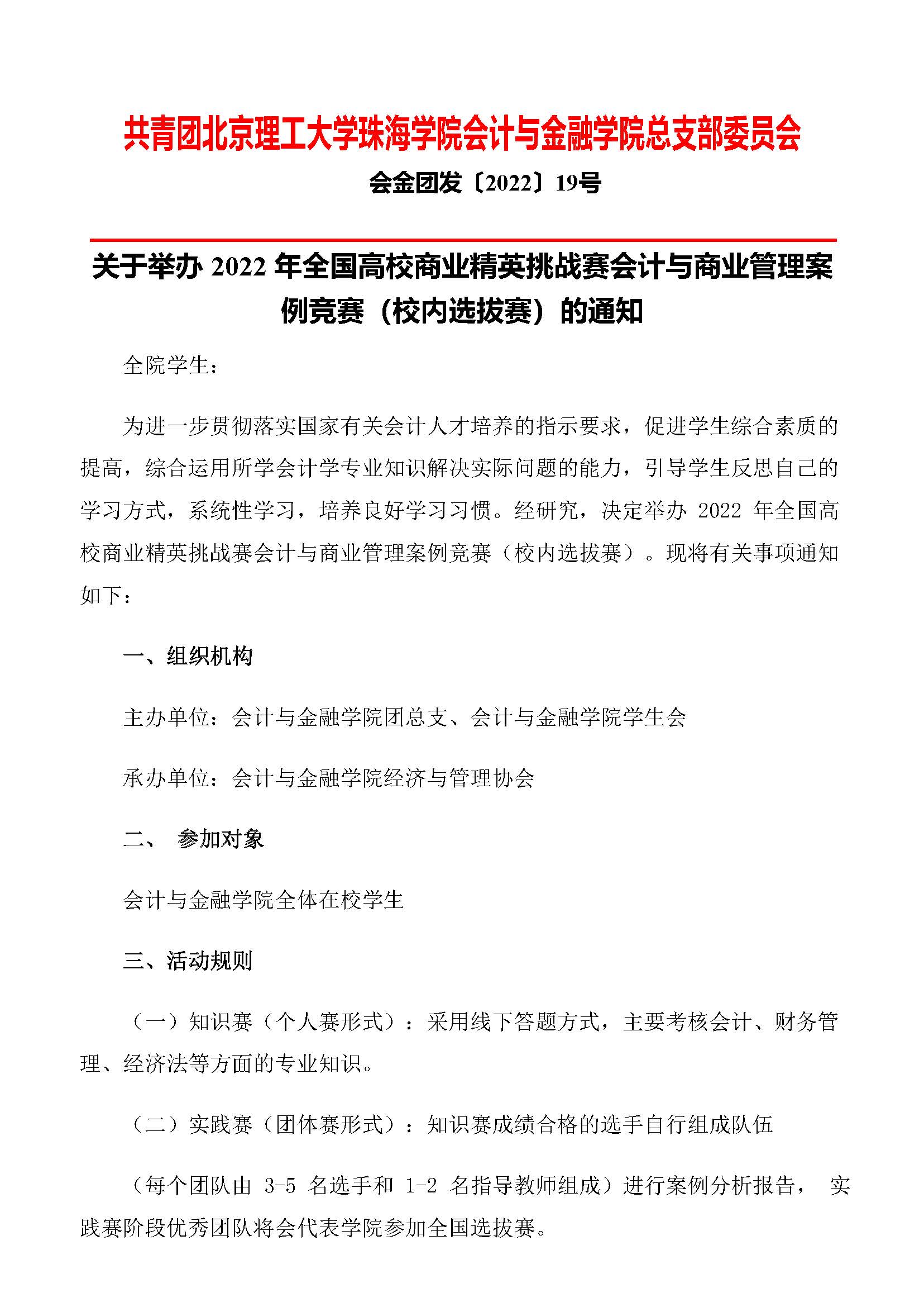 会金团发〔2022〕 19号 关于举办 2022 年全国高校商业精英挑战赛会计与商业管理案例竞赛(校内选拔赛)的通知