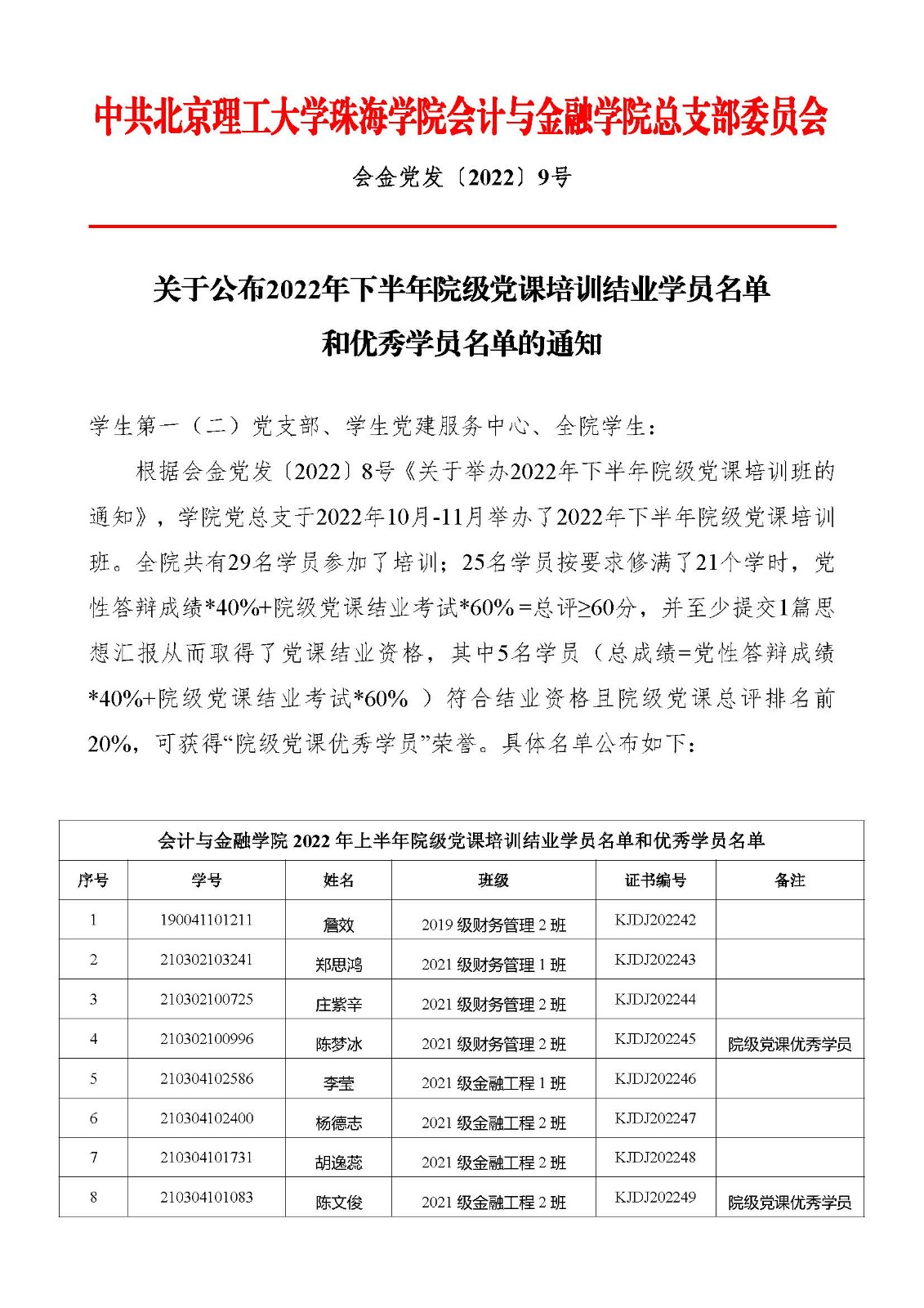 会金党发〔2022〕9号 关于公布2022年下半年院级党课培训结业学员名单 和优秀学员名单的通知