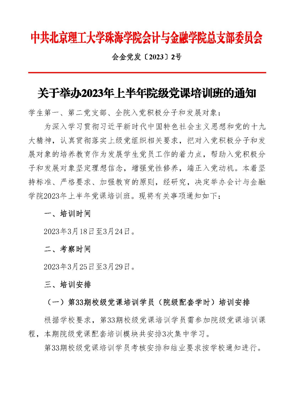 会金党发〔2023〕2号 关于举办2023年上半年院级党课培训班的通知