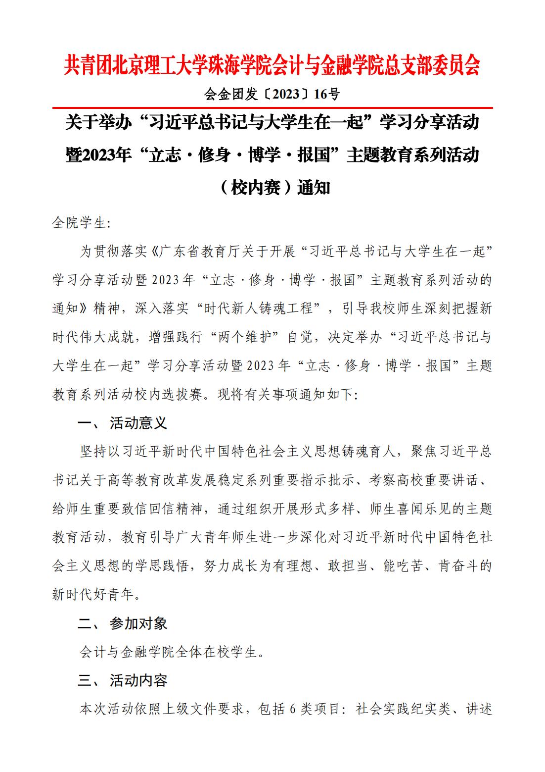 会金团发〔2023〕16号 关于举办“习近平总书记与老员工在一起”学习分享活动暨2023年“立志·修身·博学·报国”主题教育系列活动(校内赛)通知
