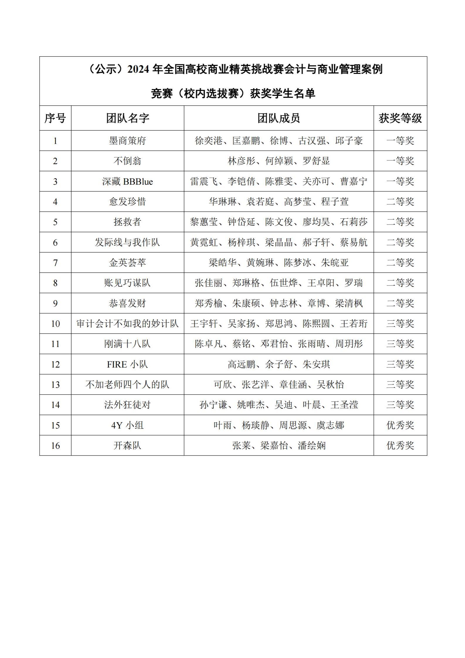 (公示)2024年全国高校商业精英挑战赛会计与商业管理案例竞赛(校内选拔赛)获奖名单
