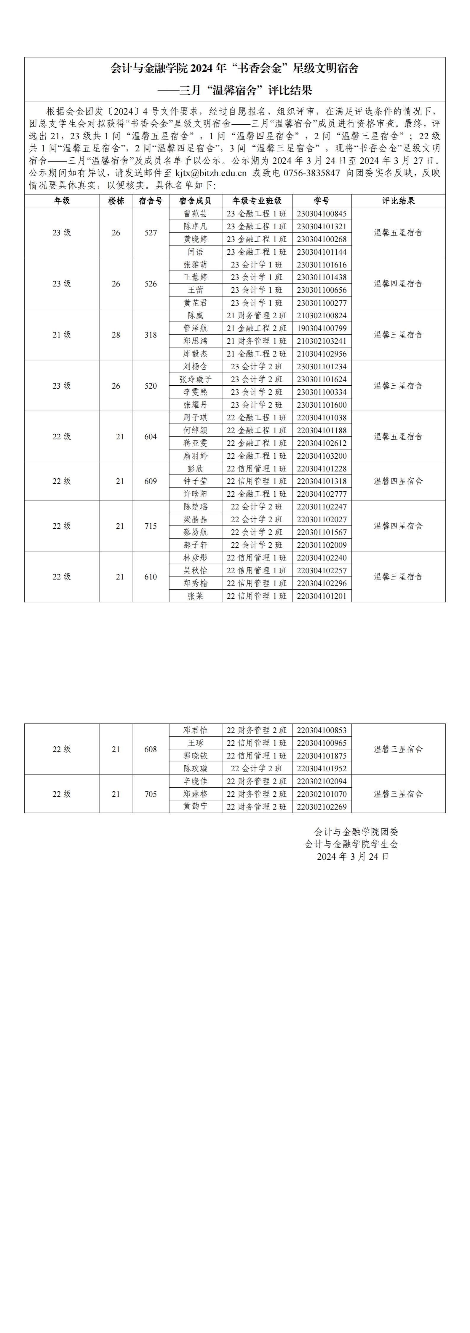 (公示)2024年“书香会金”星级文明宿舍——三月“温馨宿舍”评比结果