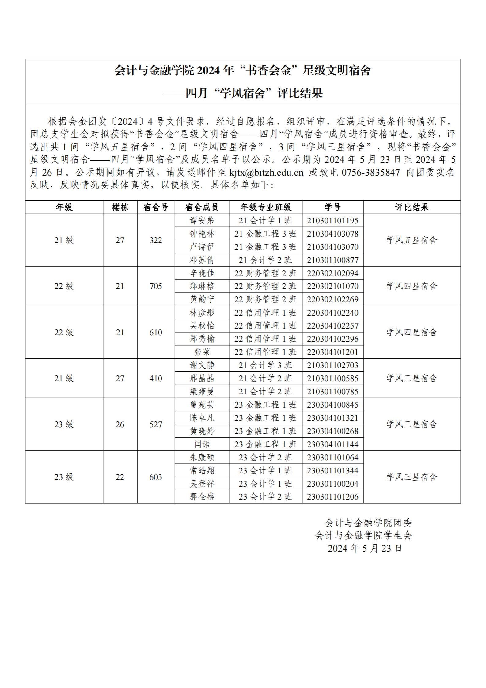 (公示)2024年“书香会金”星级文明宿舍——四月“学风宿舍”评比结果