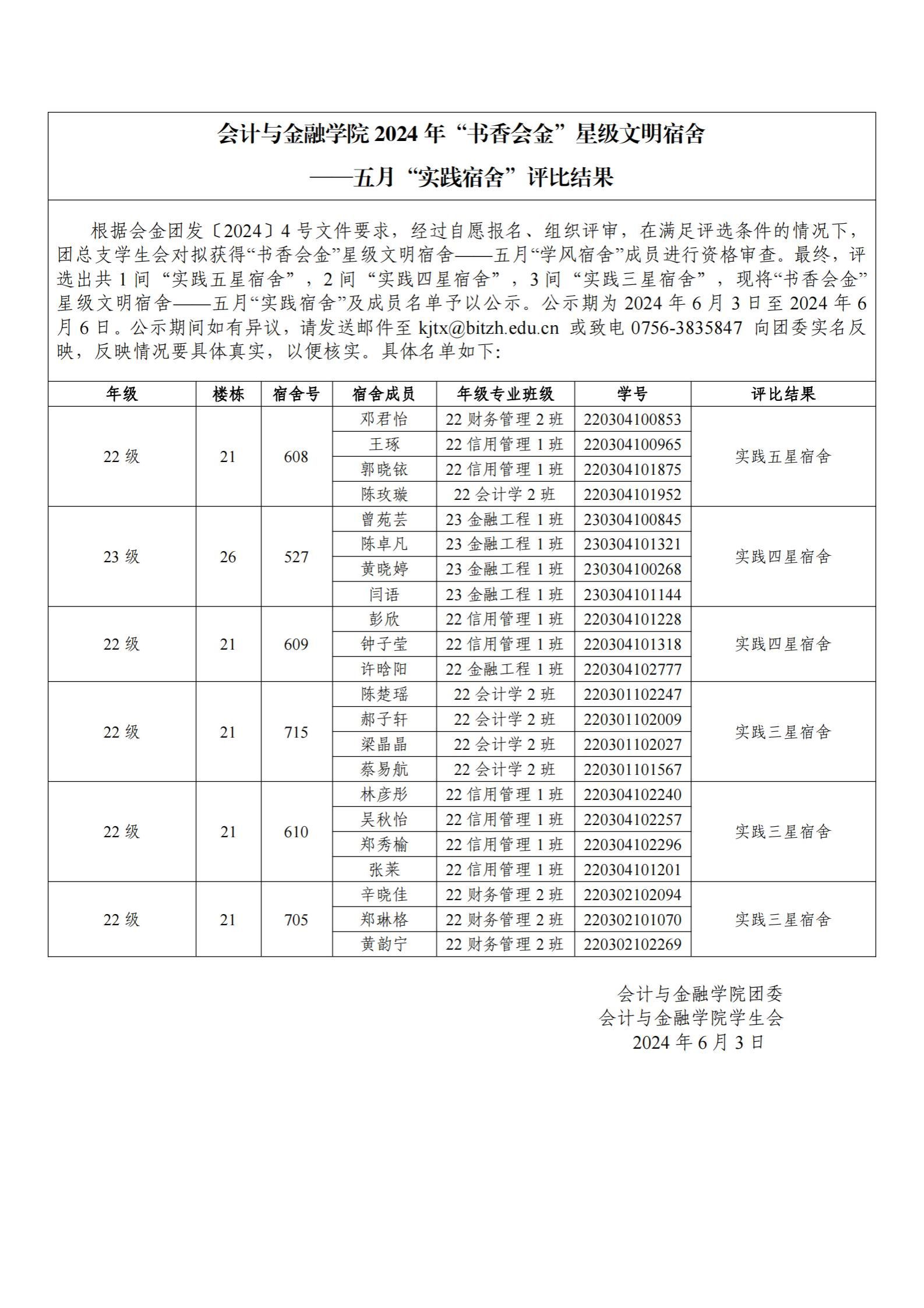 (公示)2024年“书香会金”星级文明宿舍——五月“实践宿舍”评比结果