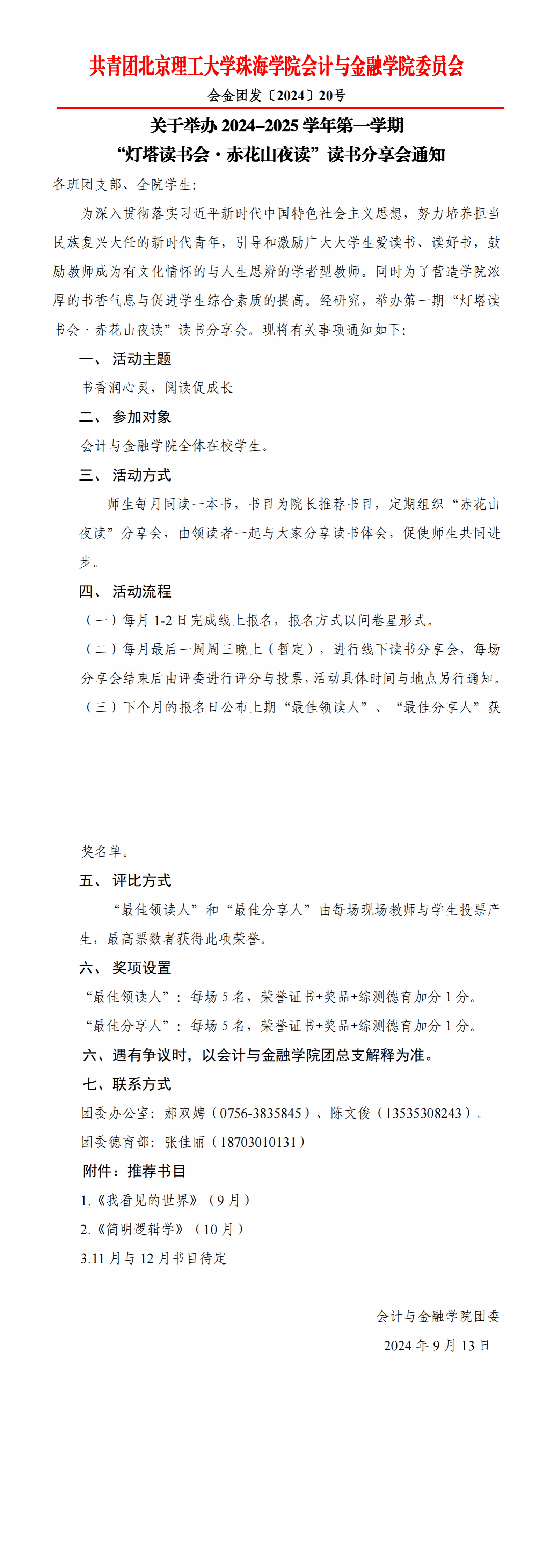 会金团发〔2024〕20号 关于举办2024-2025学年第一学期“灯塔读书会·赤花山夜读”读书分享会通知