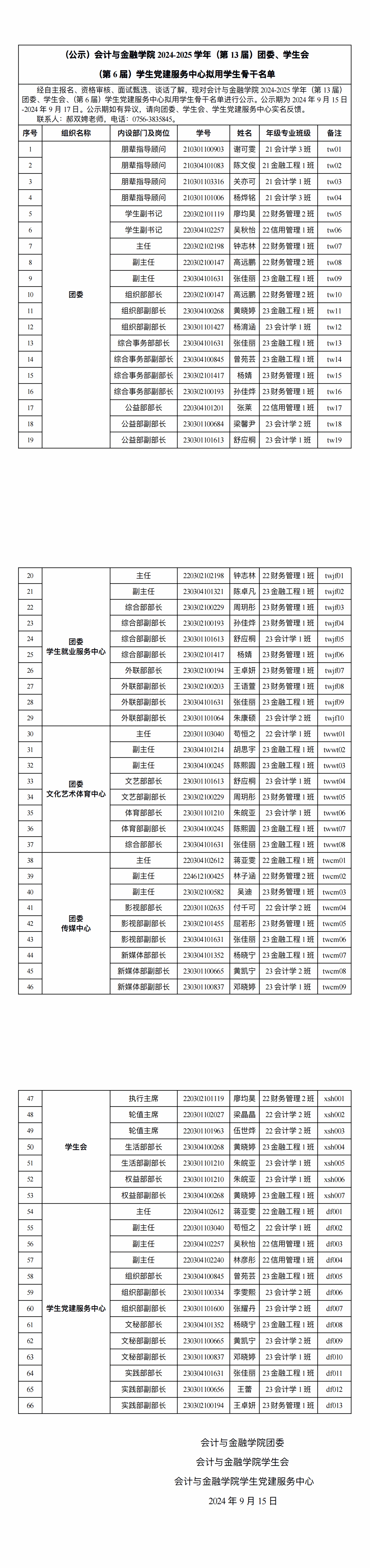 (公示)2024-2025学年(第13届)团委、员工会和(第6届)员工党建服务中心拟用员工骨干名单