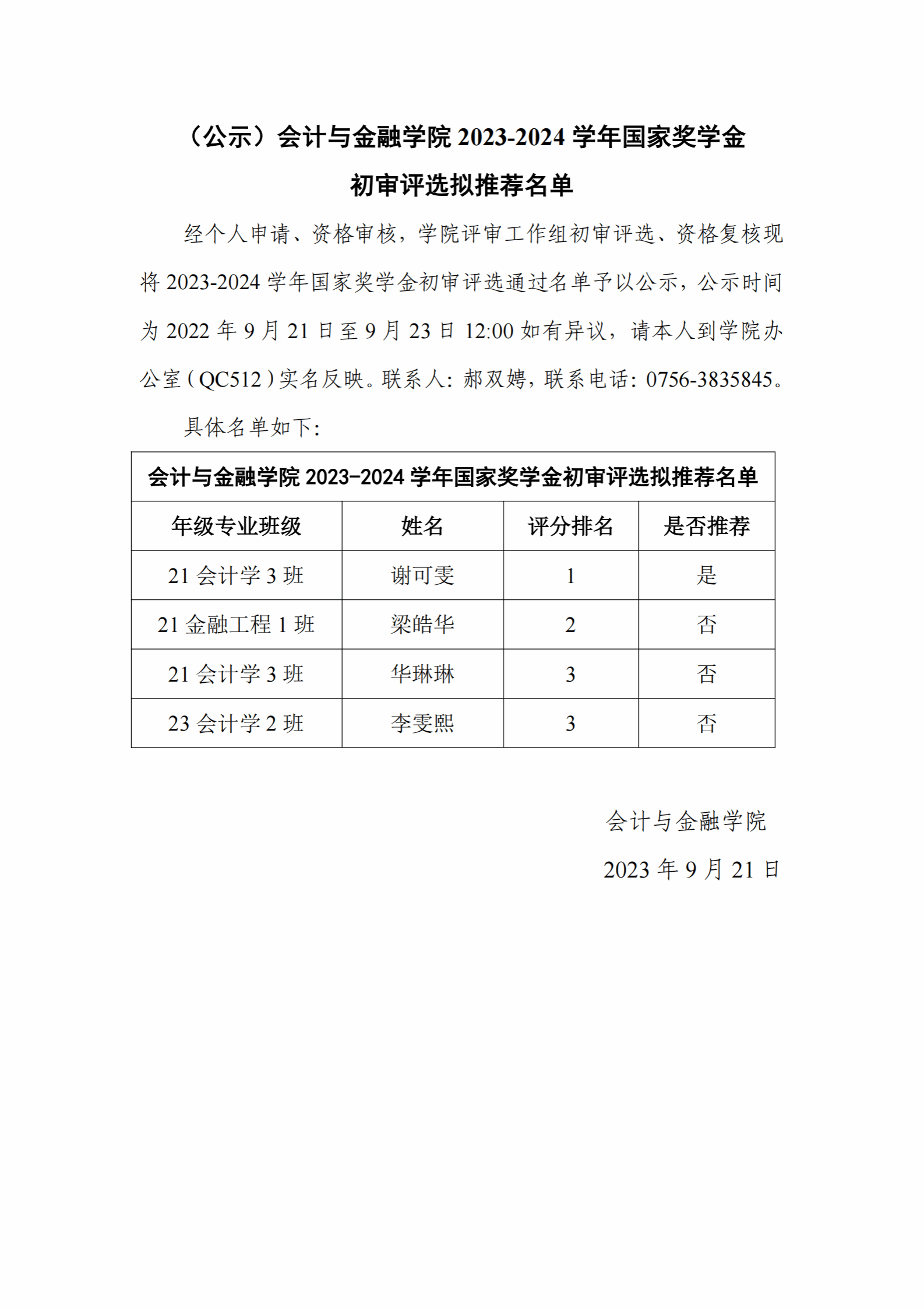 (公示)2023-2024学年国家奖学金初审评选拟推荐名单