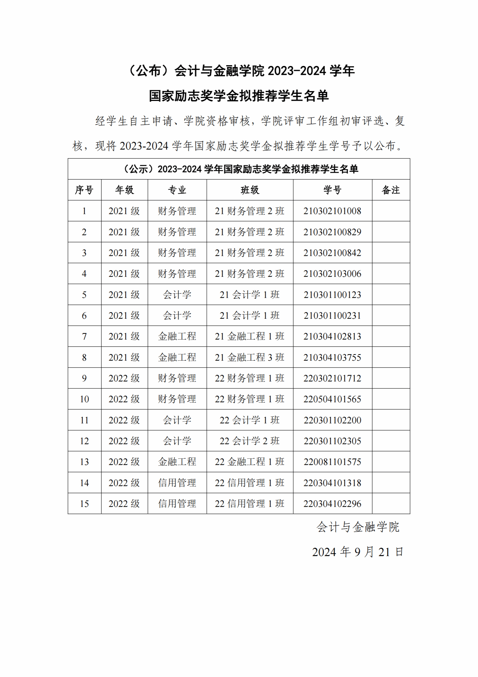 (公布)2023-2024学年国家励志奖学金拟推荐员工名单