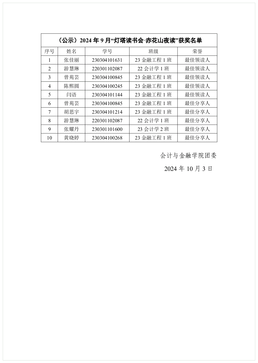 (公示)2024年9月“灯塔读书会·赤花山夜读”读书分享会获奖名单