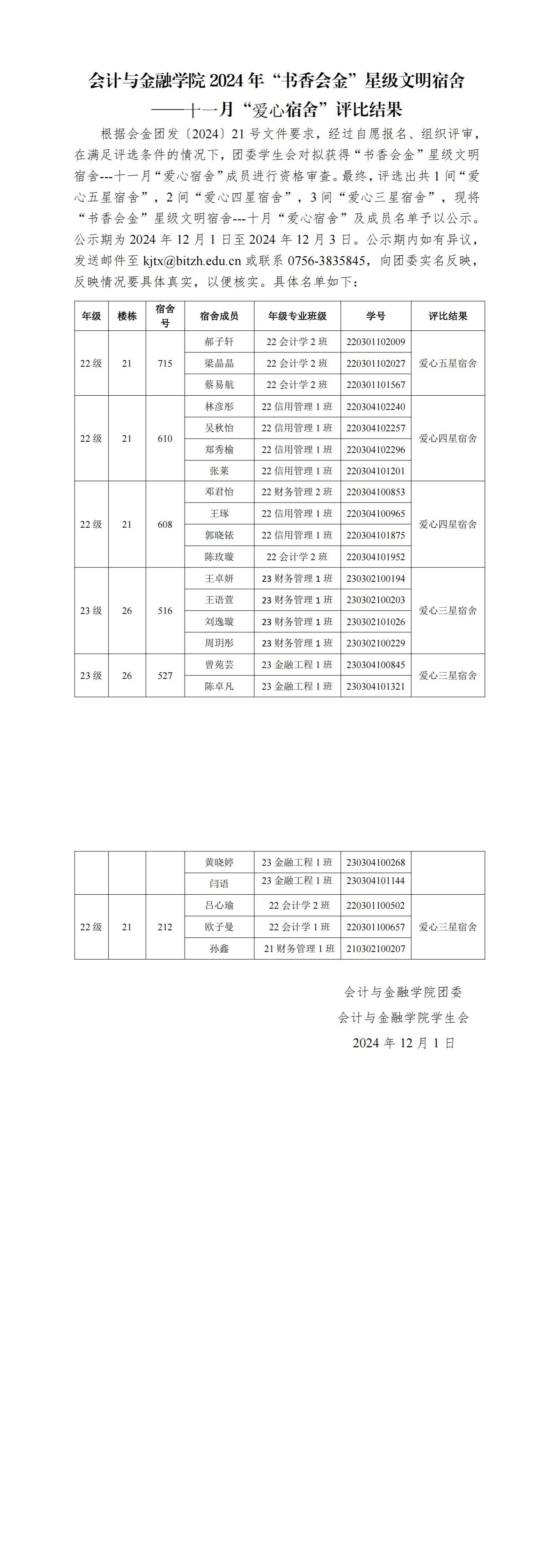 (公示)2024年“书香会金”星级文明宿舍---十一月“爱心宿舍”评比结果