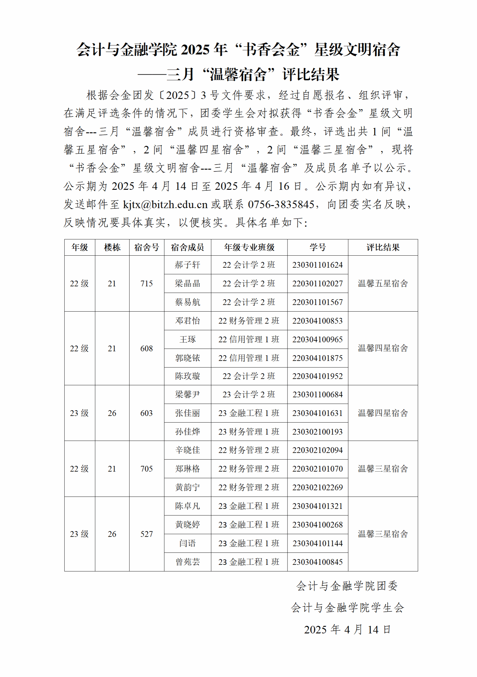 (公示)2025年“书香会金”星级文明宿舍——三月“温馨宿舍”评比结果