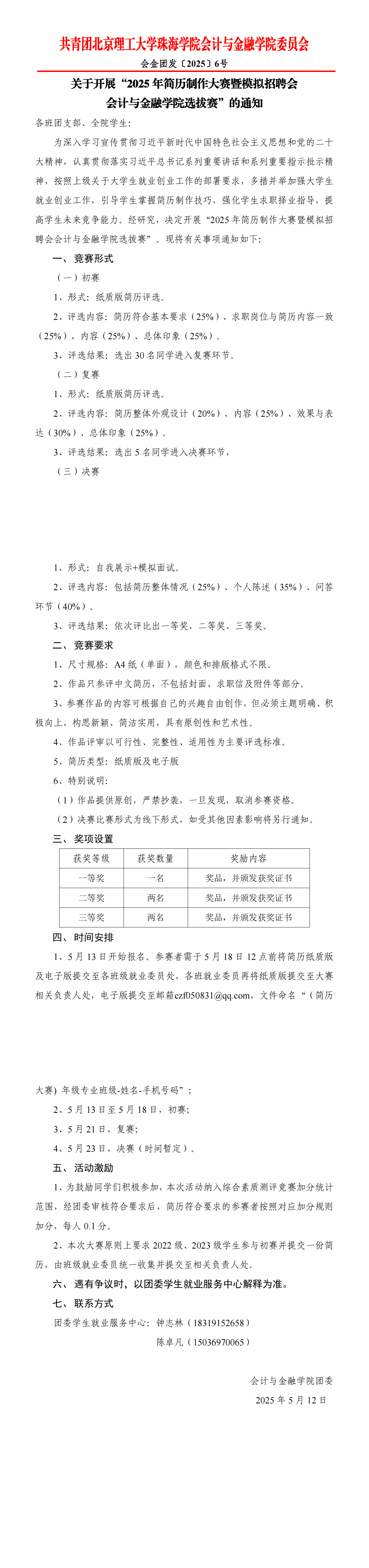 会金团发〔2025〕6号 关于开展“2025年简历制作大赛暨模拟招聘会太阳成tyc33455cc选拔赛”的通知