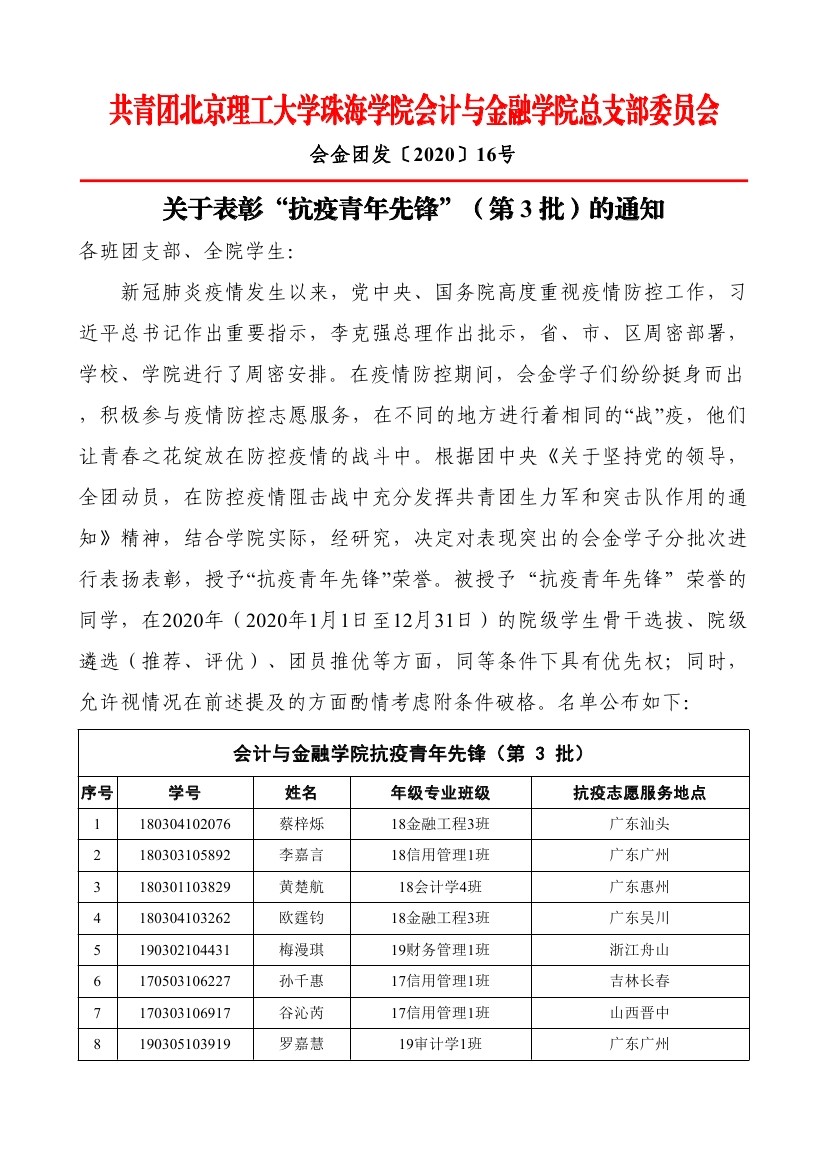 关于表彰“抗疫青年先锋”(第3批)的通知