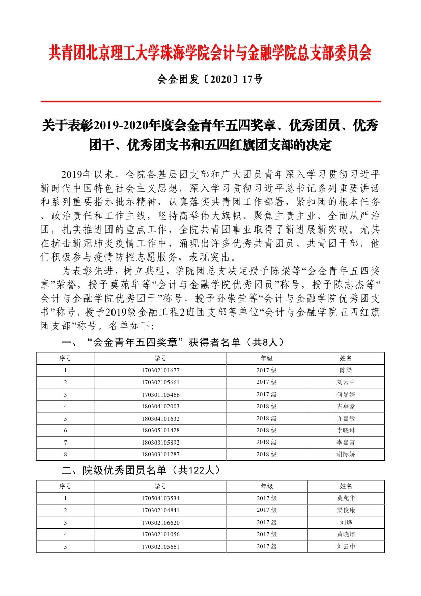 关于表彰2019-2020年度会金青年五四奖章、优秀团员、优秀团干、优秀团支书和五四红旗团支部的决定