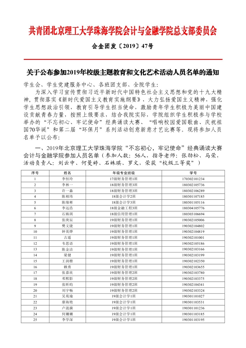 关于公布参加2019年校级主题教育和文化艺术活动人员名单的通知