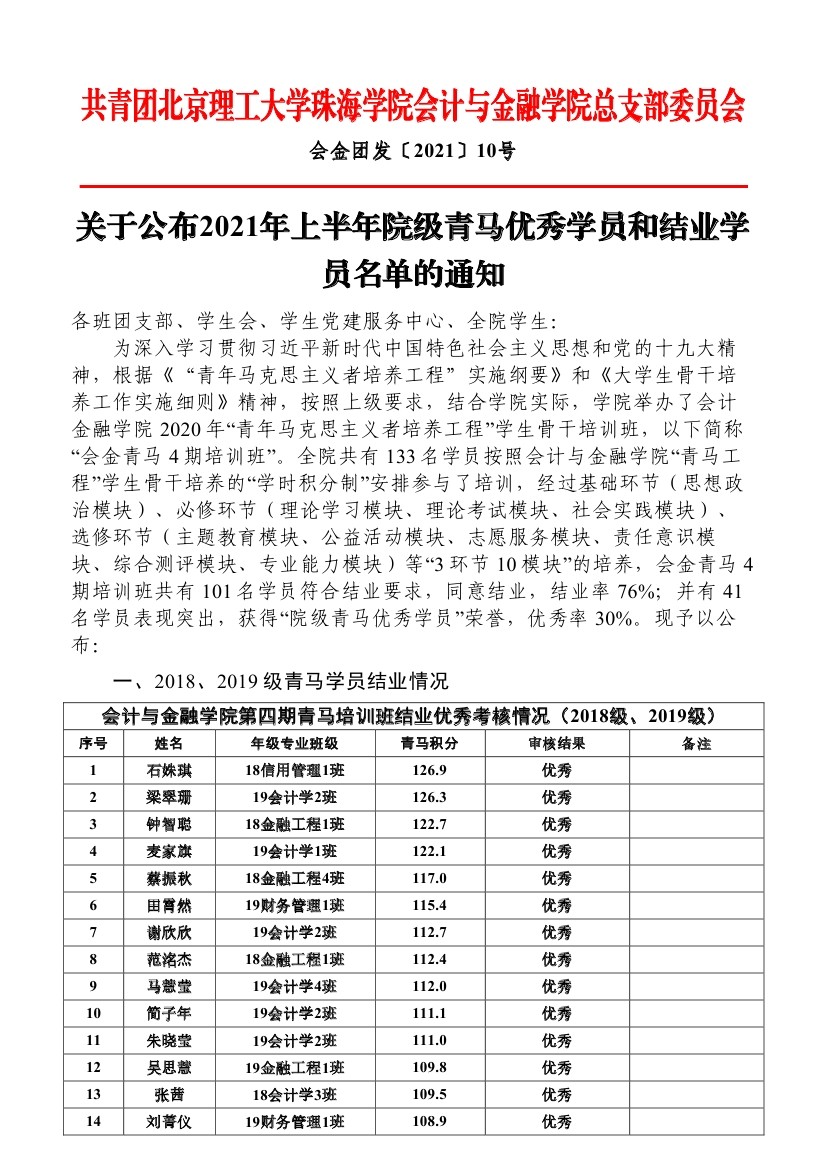 关于公布2021年上半年院级青马优秀学员和结业学员名单的通知