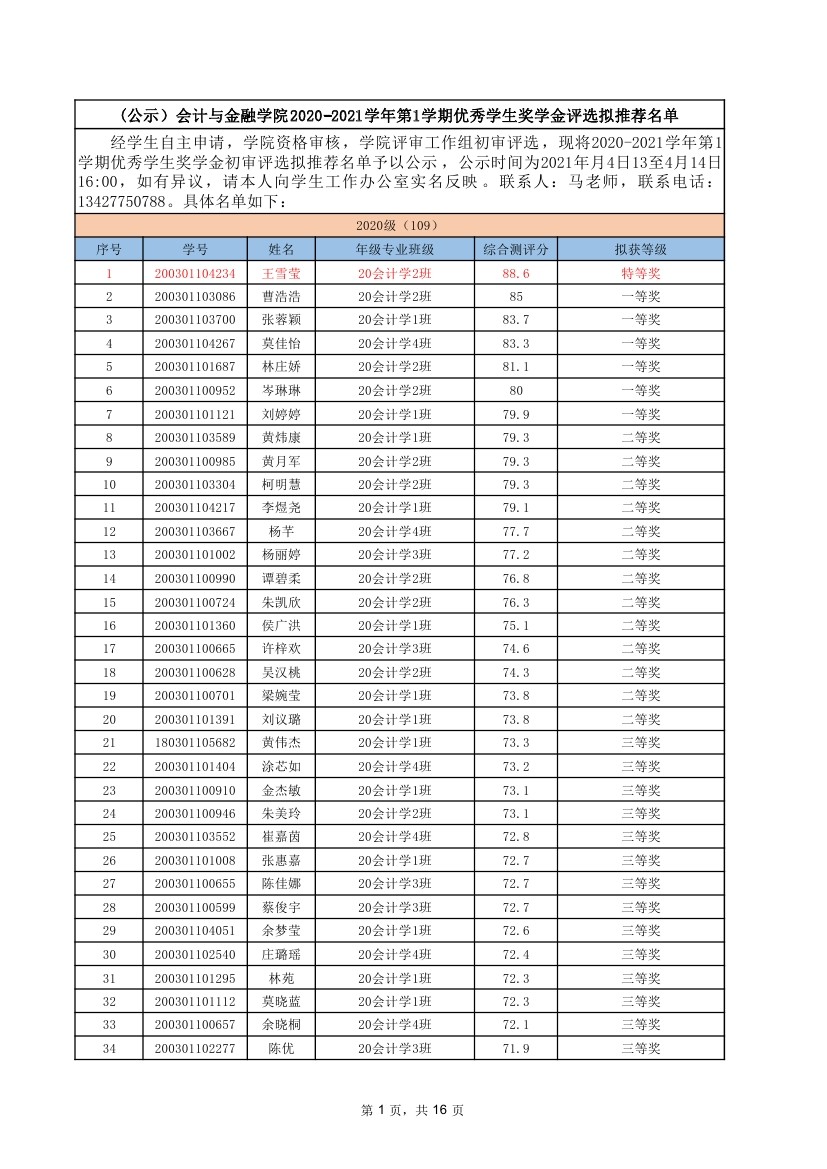 (公示)2020-2021学年第1学期优秀员工奖学金评选拟推荐名单