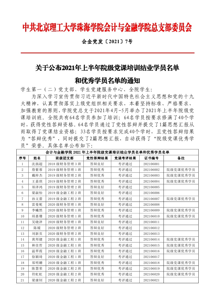 关于公布2021年上半年院级党课培训结业学员和优秀学员名单的通知
